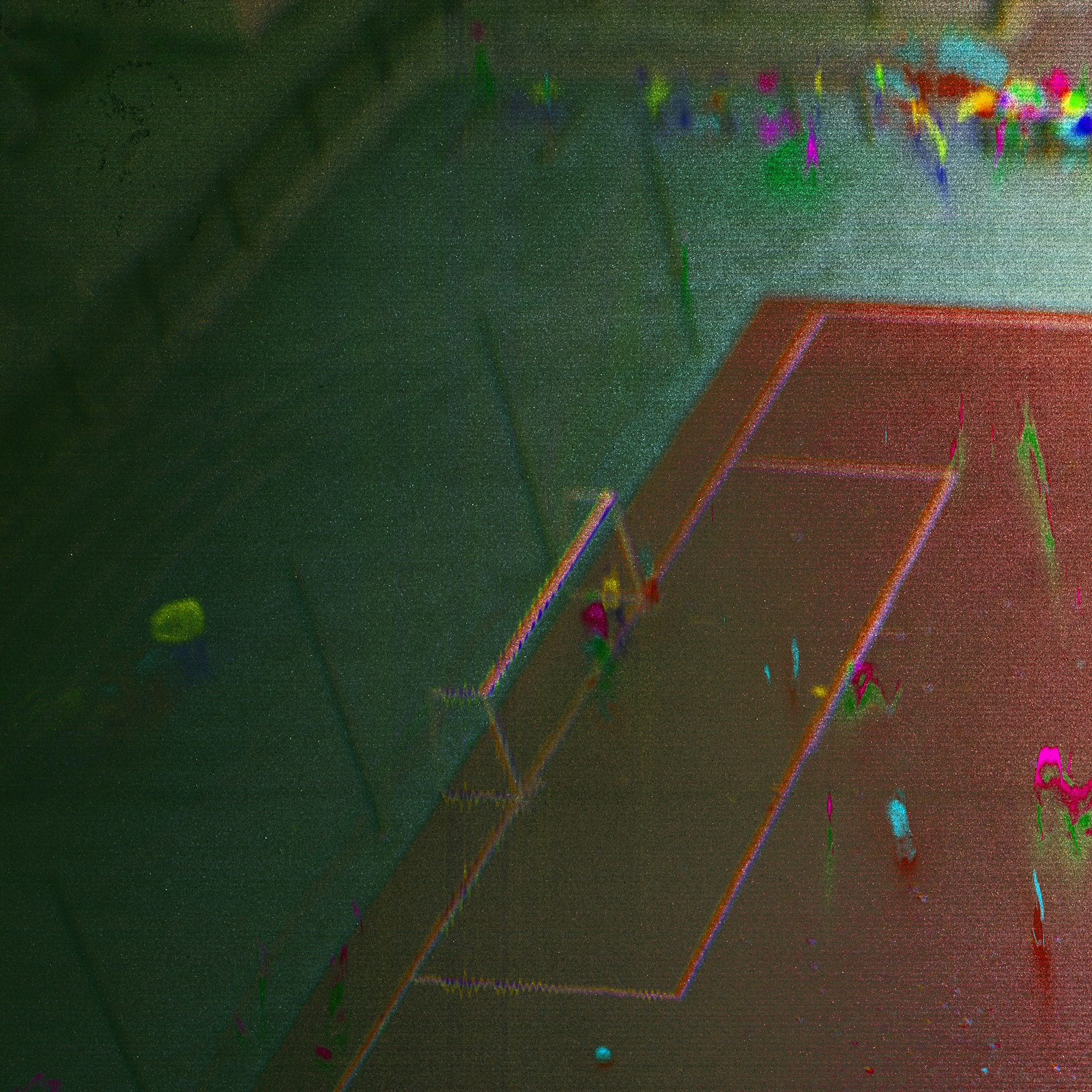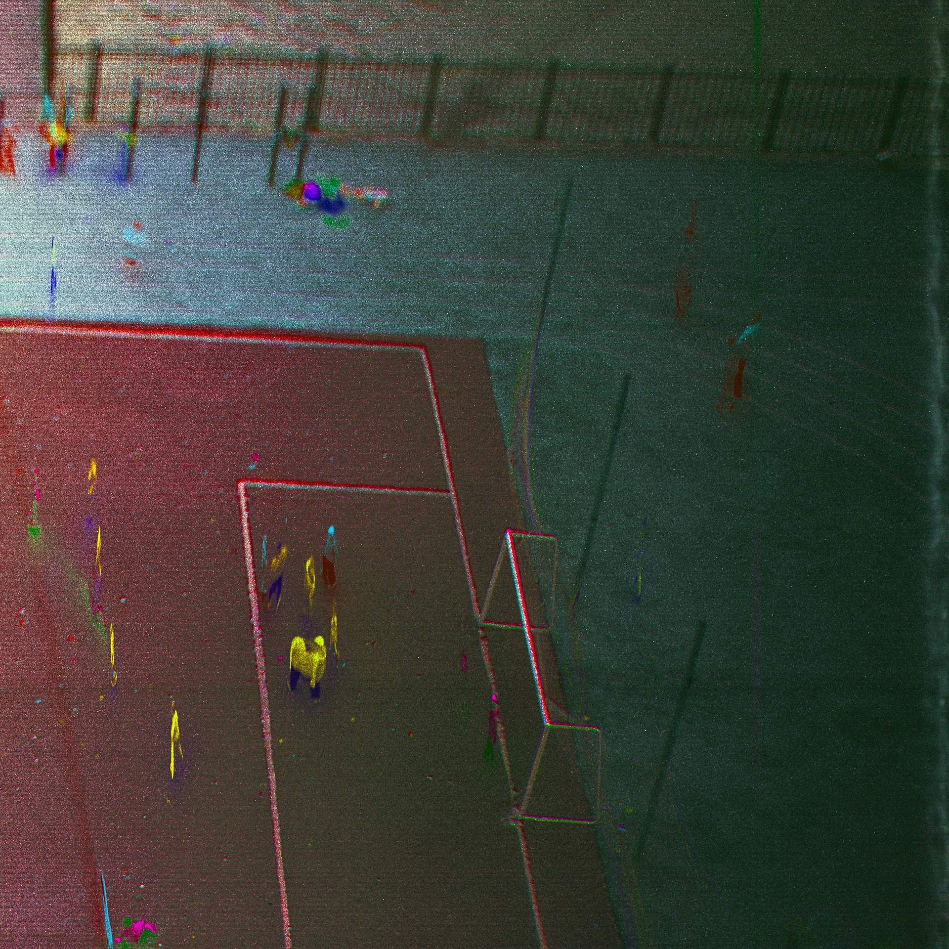 Футбольное поле, которое обычно воспринимается утилитарно — место игры, правила, сетка ворот, — в твоём изображении становится космограммой. Центральный круг — словно мандала, вокруг которой движутся люди-фигуры, растянутые в цветовых хвостах. Каждый игрок превращается в энергетический след, в «луч» или «тень времени», а сама игра становится ритуалом движения в пространстве, где правила спорта и законы Вселенной переплетаются.