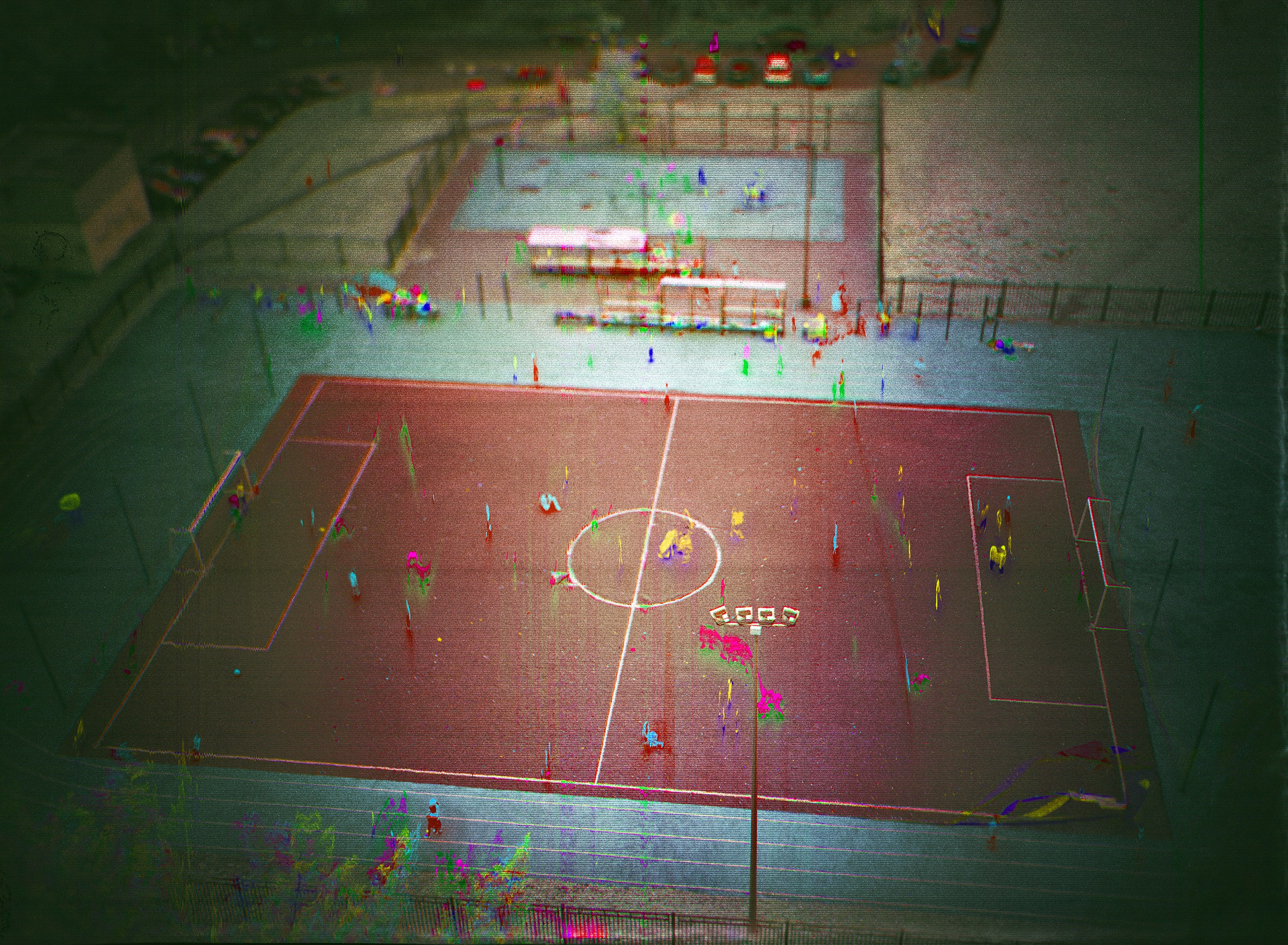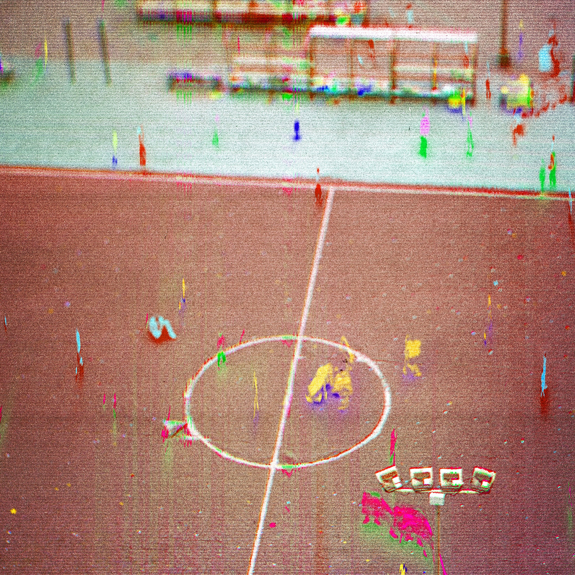 Центральный круг поля здесь превращается в мандалу, точку отсчёта движения. Игроки, чьи тела распадаются на цветовые следы, больше не просто участники матча: они — носители энергии, «следы времени», существа, оставляющие отпечатки в хроно-структуре. Игра, которую мы привыкли считать развлечением, оказывается тренировкой движения душ, репетицией гармонии и хаоса.