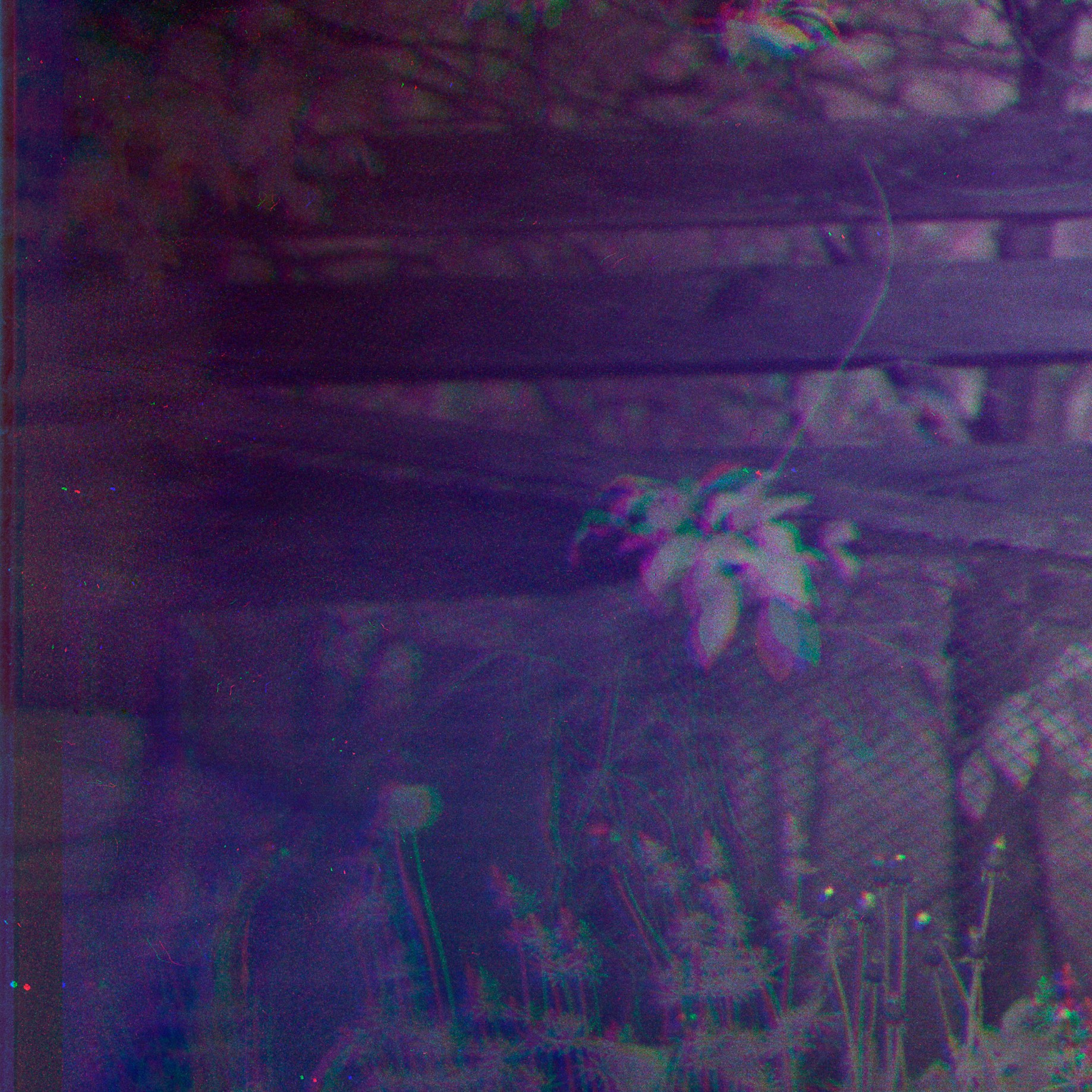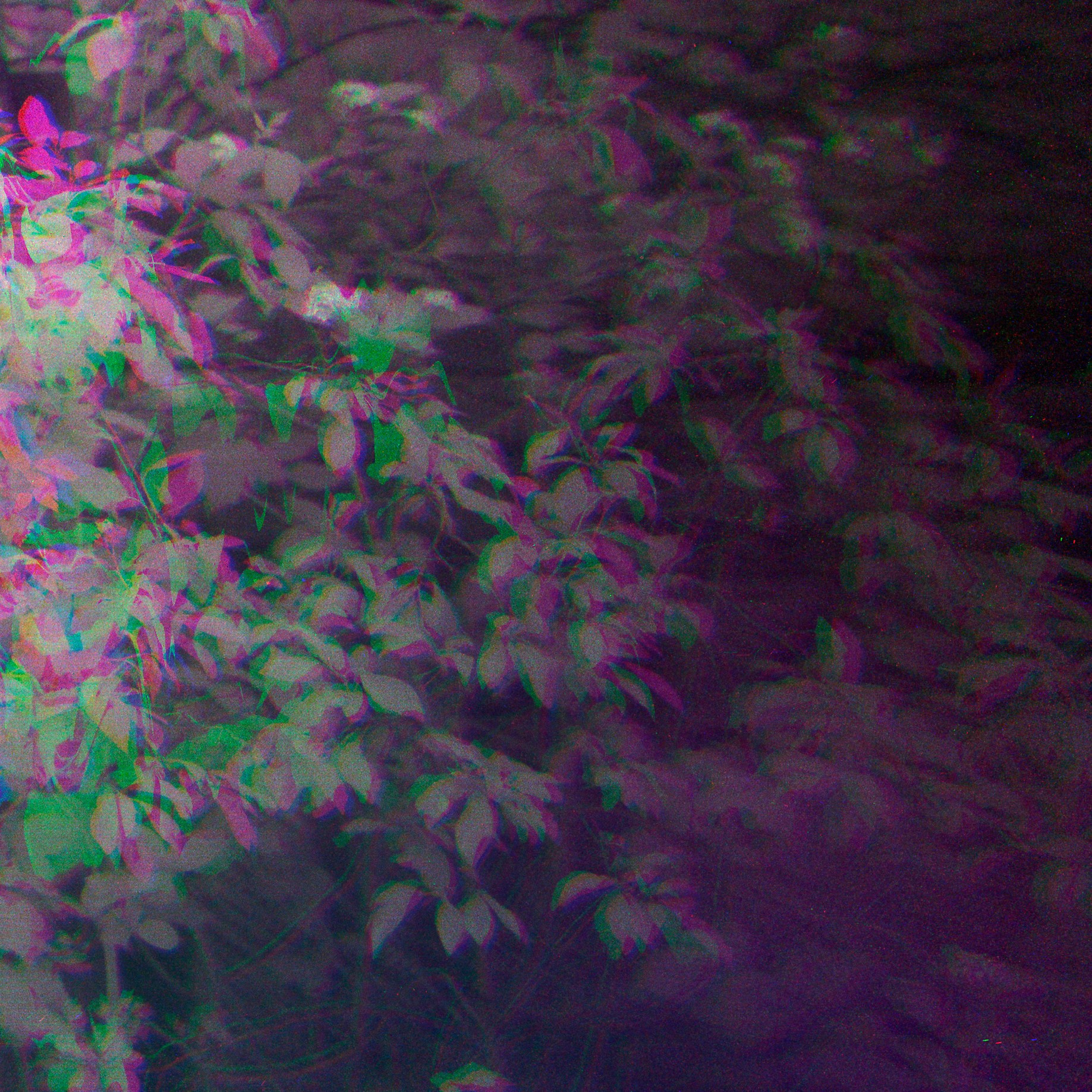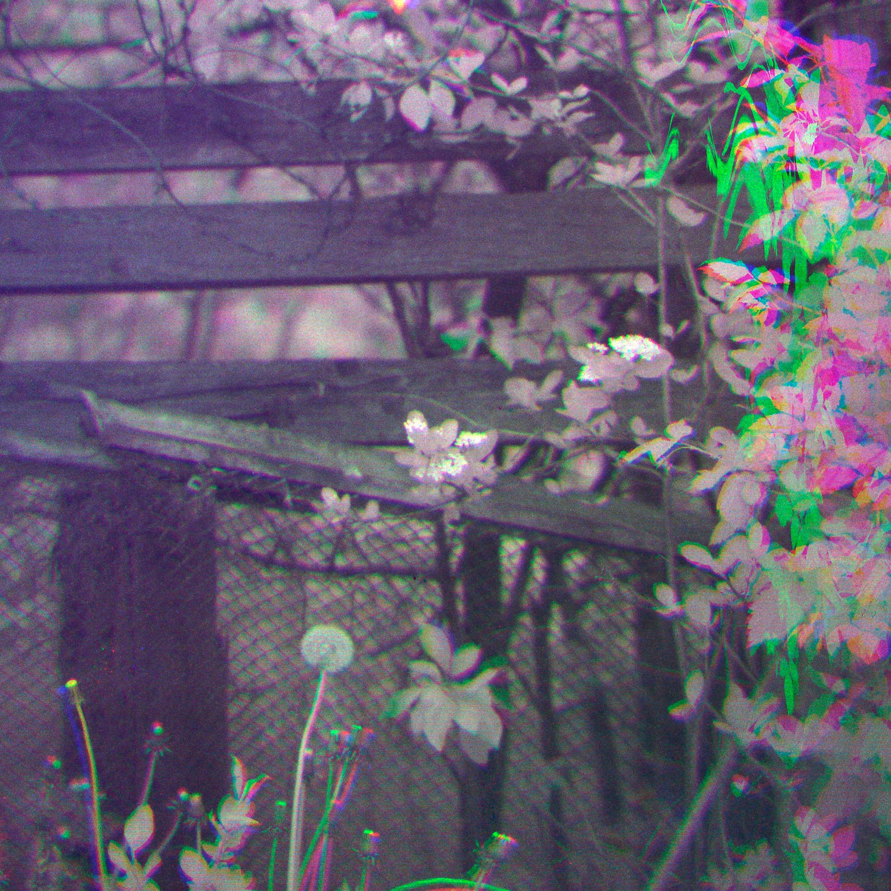 На первом уровне мы видим привычный пейзаж: заросший угол частного сада, старый забор, яблоня, одуванчики. На втором уровне — карта дрейфа: множественные экспозиции цвета, смещения каналов, локальные хроматические артефакты, которые не прячут, а показывают движение материала. Здесь цвет не маскирует форму, он её расщепляет — как спектр, вытянутый во времени. Листья яблони не просто зелёные; их структура — это хроника колебаний воздуха, света и механической неточности объектива. Они распадаются на составляющие: магента, лайм, бирюза — цвета становятся записью кинетики.